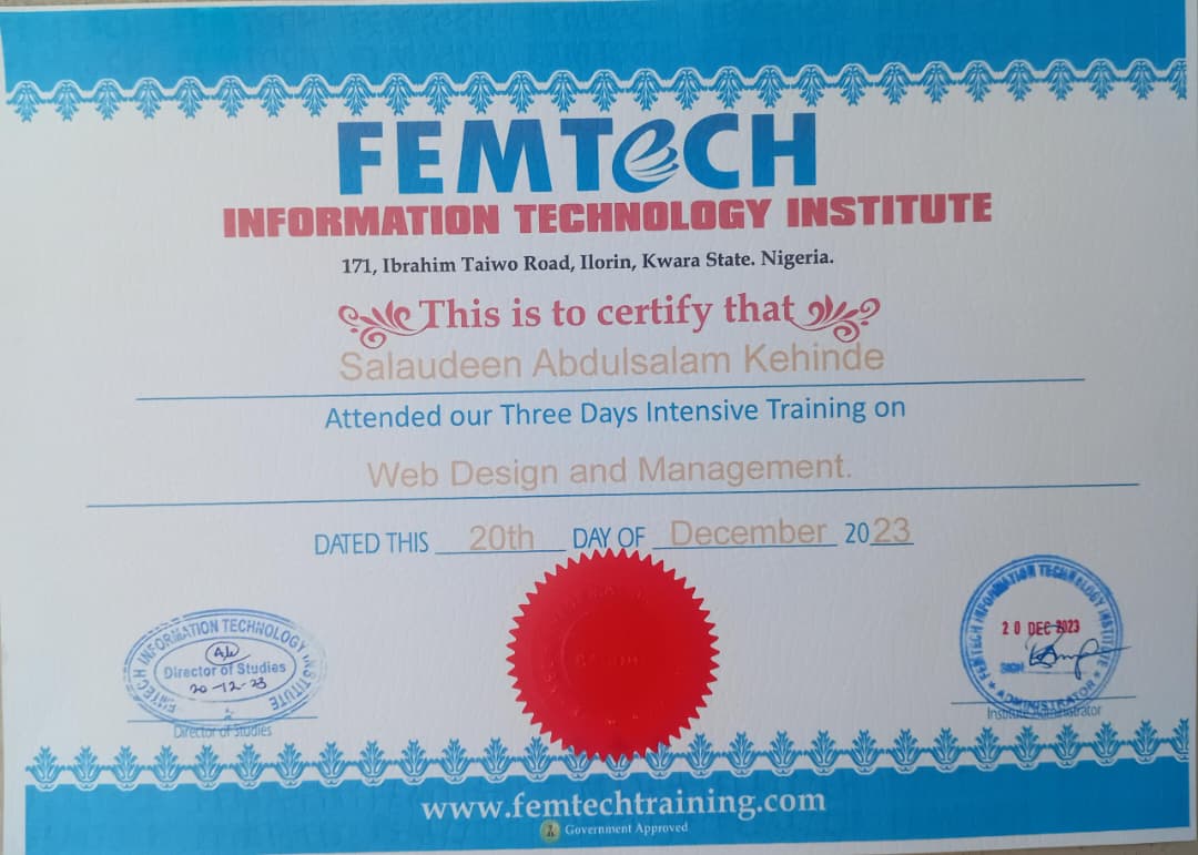 Recognizing the need for formal education to sharpen his skills, Salaudeen enrolled at FEMTECH Institute in Ilorin, located on Taiwo Road. There, he studied Web Development and Website Management, focusing heavily on WordPress, the world’s leading Content Management System (CMS). During his time at FEMTECH, he developed real-world projects, learned how to manage dynamic websites, and received a professional certification in WordPress development and CMS website management.